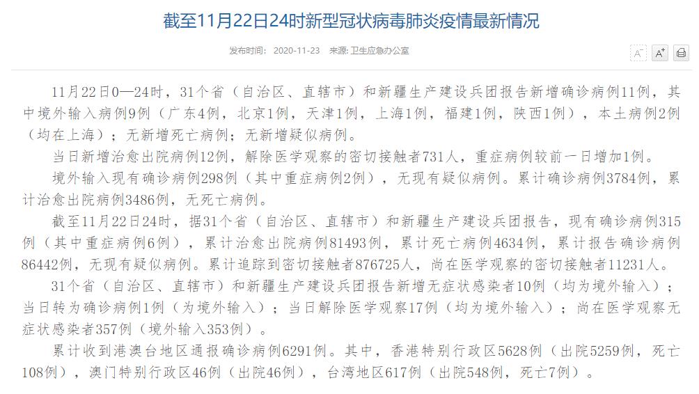 情況顯示,截至11月22日24時(shí),據(jù)31個(gè)省(自治區(qū)、直轄市)和新疆生產(chǎn)建設(shè)兵團(tuán)報(bào)告,現(xiàn)有確診病例315例(其中重癥病例6例),累計(jì)治愈出院病例81493例,累計(jì)死亡病例4634例,累計(jì)報(bào)告確診病例86442例,無(wú)現(xiàn)有疑似病例。累計(jì)追蹤到密切接觸者876725人,尚在醫(yī)學(xué)觀察的密切接觸者11231人。