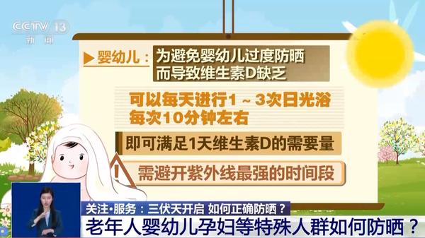 嬰幼兒:為了避免嬰幼兒過(guò)度防曬而導(dǎo)致維生素D缺乏,可以每天進(jìn)行1至3次日光浴,每次10分鐘左右,即可滿足1天維生素D的需要量,但需避開(kāi)紫外線最強(qiáng)的時(shí)間段。小于6個(gè)月的嬰兒不建議使用防曬產(chǎn)品,大于6個(gè)月的嬰幼兒建議以“硬防曬”為主。即使涂抹了防曬產(chǎn)品,也不宜在強(qiáng)烈陽(yáng)光下活動(dòng)。
