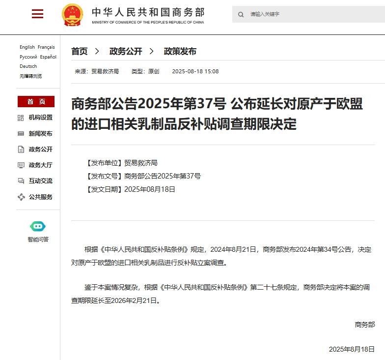 商務(wù)部公告2025年第37號(hào) 公布延長(zhǎng)對(duì)原產(chǎn)于歐盟的進(jìn)口相關(guān)乳制品反補(bǔ)貼調(diào)查期限決定