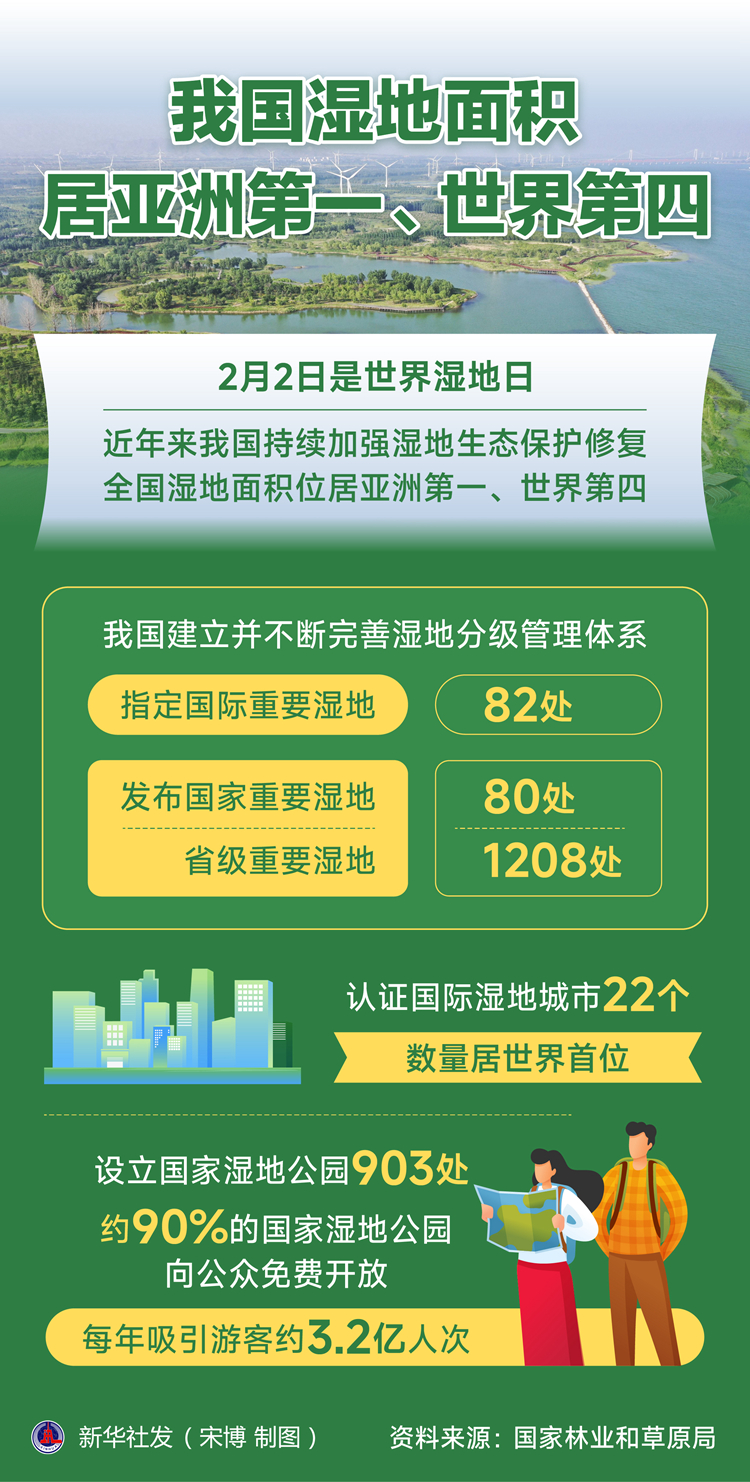 新華社北京2月2日電(記者黃垚)2月2日是世界濕地日。記者當天從國家林業(yè)和草原局獲悉,近年來我國持續(xù)加強濕地生態(tài)保護修復,全國濕地面積位居亞洲第一、世界第四,濕地保護形成重點治理和分類保護相結合的新格局。