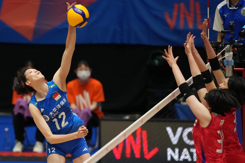 6月4日,中國(guó)隊(duì)球員李盈瑩(左)在比賽中扣球。新華社記者 張笑宇 攝