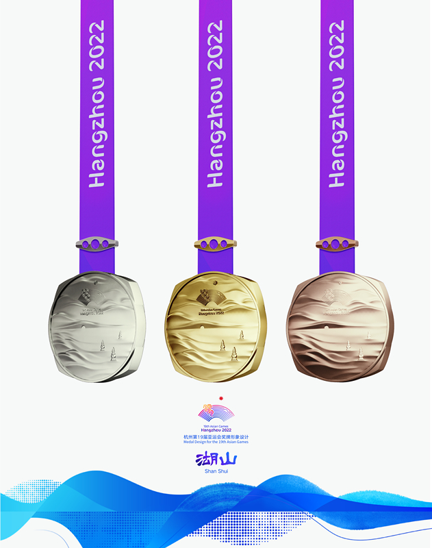 獎牌取名為“湖山”,它的設計靈感源自五千年良渚文明,展示中國江南文化,呈現(xiàn)杭州山水景觀。在亞運會獎牌設計中首次將方形玉琮和圓形獎章融為一體,其中獎牌正面用凸出的線條勾勒出“三面云山一面城”的杭城畫卷,湖水漣漪,山巒起伏;獎牌背面,形似方形印章,寓意運動員們在杭州亞運會上留下美好的印記。