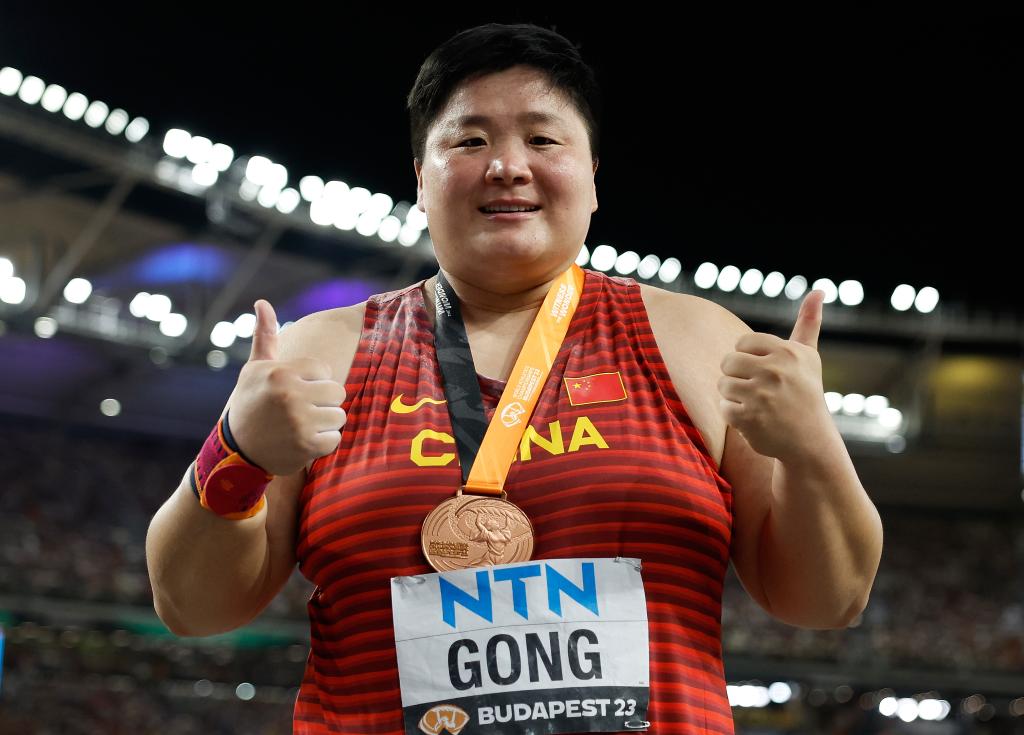 8月26日,中國選手鞏立姣在決賽后慶祝。當(dāng)日,在匈牙利布達佩斯舉行的2023世界田徑錦標(biāo)賽女子鉛球決賽中,中國選手鞏立姣以19米69的成績獲得季軍。新華社記者王麗莉攝