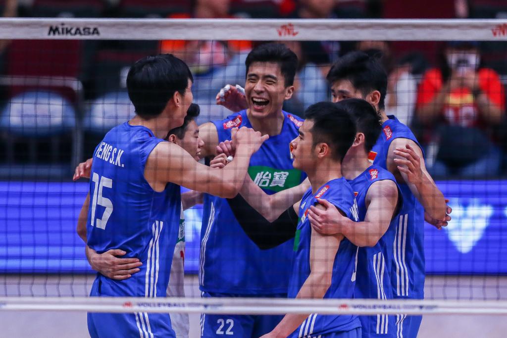 7月9日,中國(guó)隊(duì)球員在比賽中慶祝得分。當(dāng)日,在菲律賓帕賽舉行的2023年世界男排聯(lián)賽菲律賓站比賽中,中國(guó)隊(duì)以1:3不敵加拿大隊(duì)。新華社發(fā)(烏馬利攝)