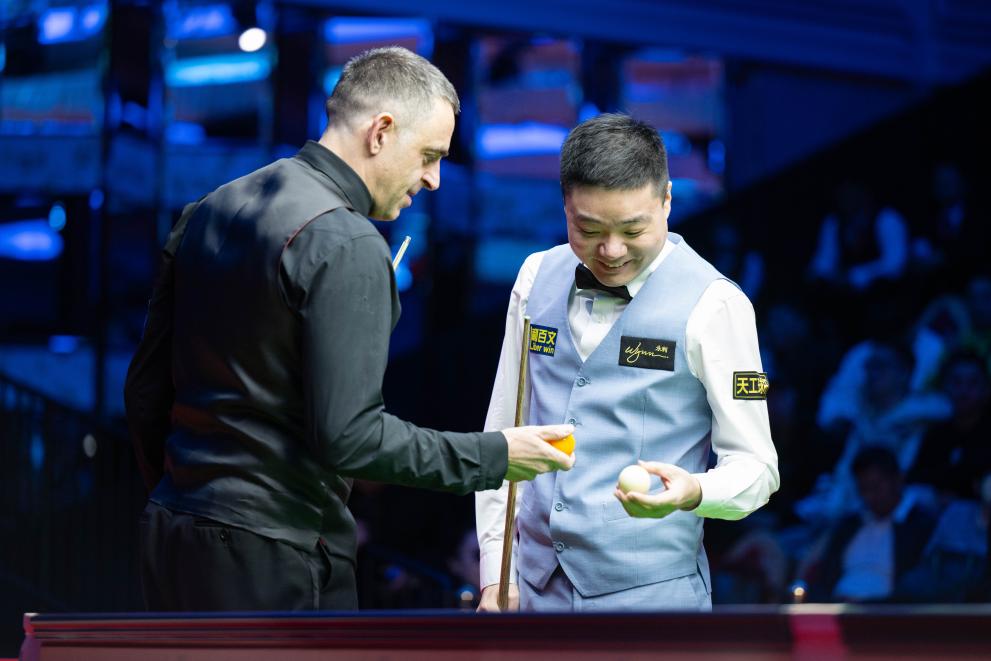 12月25日,奧沙利文(左)與丁俊暉在表演賽中。當日,2023年澳門斯諾克大師邀請賽拉開帷幕。新華社記者 張金加 攝