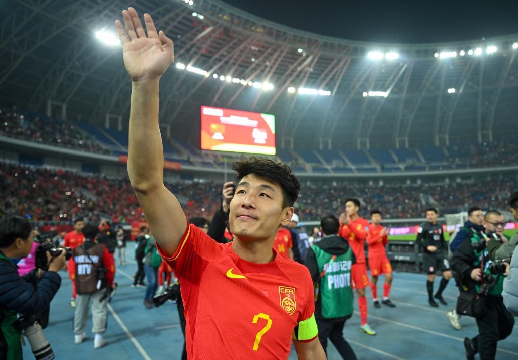 3月26日,武磊在2026年國際足聯(lián)世界杯亞洲區(qū)預(yù)選賽36強(qiáng)賽C組中國隊主場4:1戰(zhàn)勝新加坡隊的比賽后向觀眾致意。新華社記者 孫凡越 攝