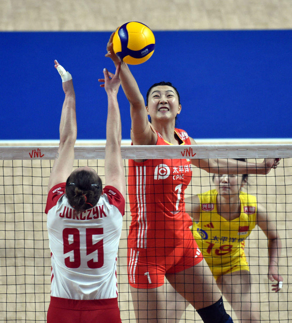 6月16日,中國隊(duì)球員袁心玥(中)在比賽中吊球。新華社記者 盧炳輝 攝