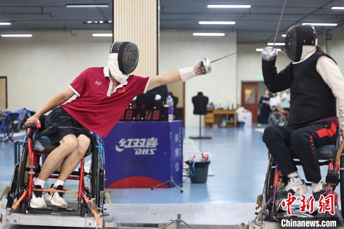 即將出征巴黎殘奧會(huì)的擊劍運(yùn)動(dòng)員仲賽春(左)與隊(duì)友胡道亮練習(xí)擊劍動(dòng)作。中新網(wǎng)記者泱波 攝