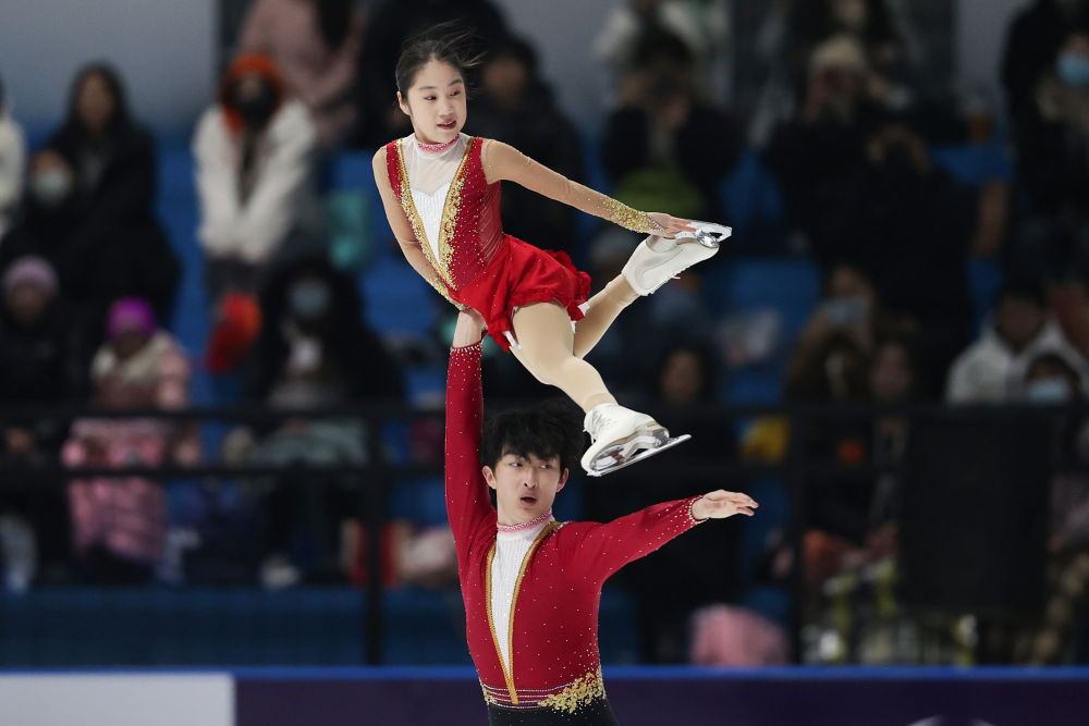 1月19日,郭蕊(上)/張益文在雙人滑自由滑比賽中。新華社記者 許雅楠 攝
