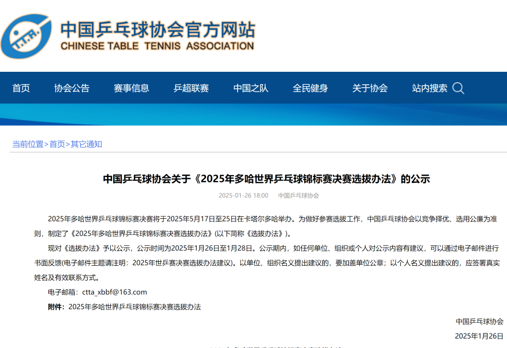 新華社北京1月26日電 中國(guó)乒協(xié)26日在官網(wǎng)公示了《2025年多哈世界乒乓球錦標(biāo)賽決賽選拔辦法》(以下簡(jiǎn)稱(chēng)《選拔辦法》)。