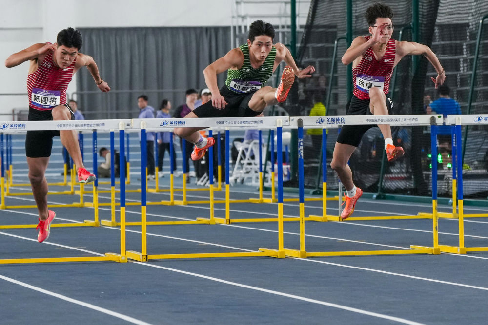 2月23日,江蘇隊選手劉俊茜(中)在男子60米欄決賽中獲得冠軍。新華社記者 李博 攝