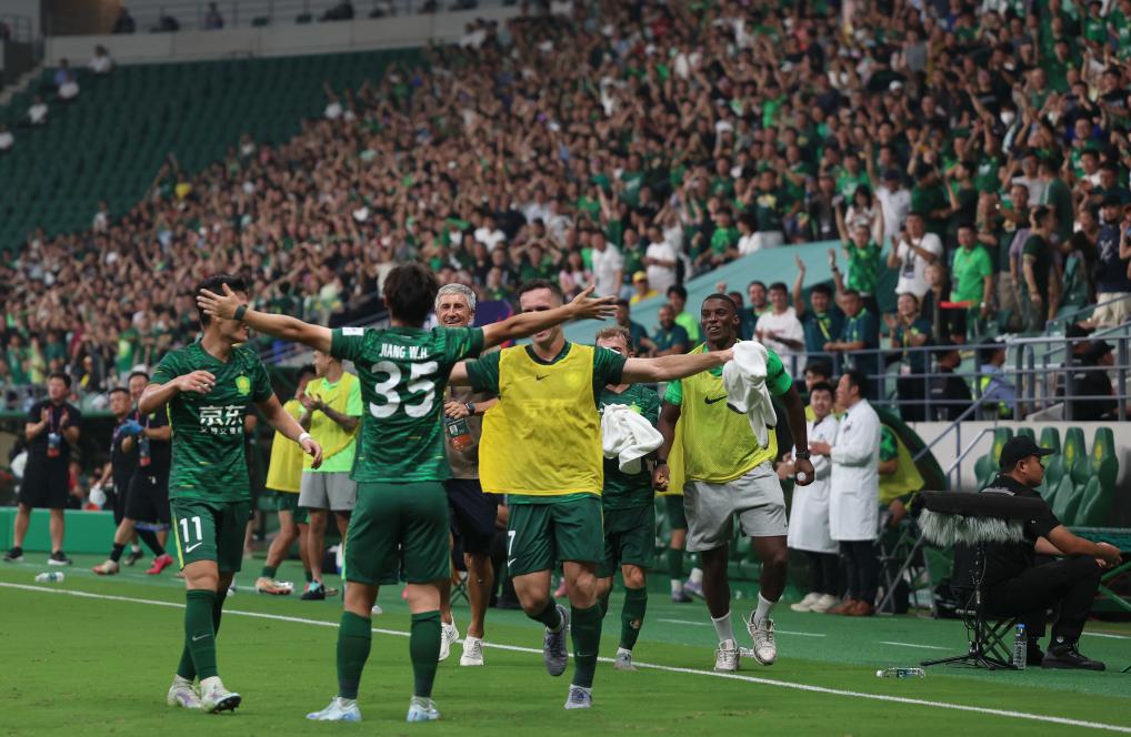 8月20日,北京國安隊(duì)球員江文豪(左二)在比賽中進(jìn)球后慶祝。新華社記者 胡星宇 攝