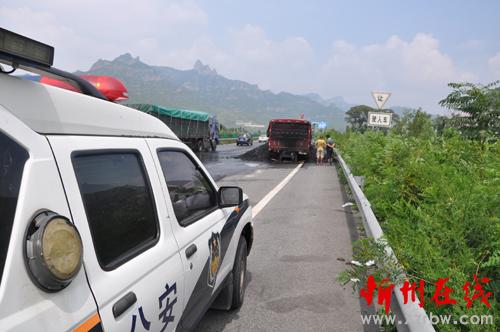 2016年8月6日上午11時20分,高速交警二支隊九大隊值班室接警陳:在五保高速(保五方向)32公里處有半掛車起火,請求出警。接到報警后,值班人員立即上報隊領導,值班教導員牛治國立即安排部署,派出事故中隊立即趕赴現(xiàn)場,秩序中隊在耿鎮(zhèn)收費站進行分流。