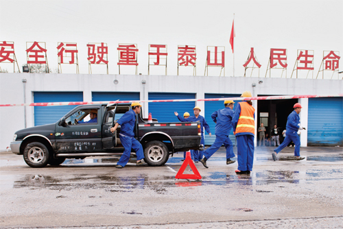 上午九時許,地處市南郊田村的忻州泉鑫公司,“開始!”隨著演練總指揮一聲令下,鳴著警笛的消防車呼嘯而至駛入警戒位置,只見數名身著紅色消防服的消防隊員迅捷下車,熟練地“接”“拉”“噴”,碩大的水柱瞬間噴涌而出,射向演習假定的高溫油罐車,頓時水霧迷漫,氣團飄移……數分鐘后,“危情警報”解除。這是全市首次危貨道路運輸交通戰(zhàn)備應急救援演練科目中的一幕。