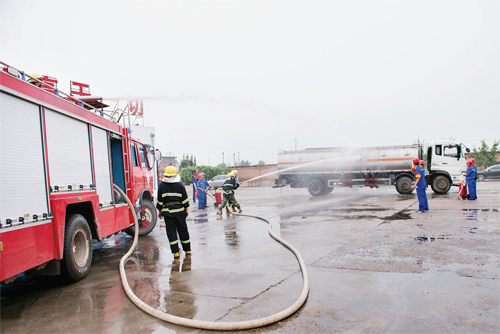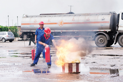 首先上場的是泉鑫石油運輸有限公司,他們演練的科目是汽柴油滅火救援。其一是假定油罐車在缷油時發(fā)生燃燒事故,接到報警后,消防車迅速趕到現場,連接好水槍做好滅火準備;應急搶險隊、車輛搶救隊、后勤保障隊也同時到達現場,拉起警戒繩,各司其職進行應急處置,成功將險情排除并清理現場。其二是油罐車在裝油時發(fā)生進油口著火險情,各隊應急救援人馬接到警情急速趕到事發(fā)現場,放好三角警示架、拉起警戒繩禁止無關人員靠近,用消防車水槍對油罐車車體進行冷卻處理,利用干粉滅火和石棉滅火等技法,最終成功處置險情。