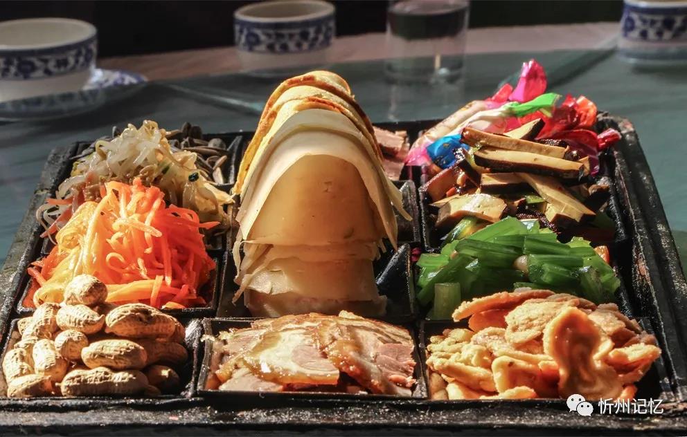 水菜盒子,是一個木制的長方形盒子,長約40多厘米,寬約20多厘米,高約10多厘米。木盒分蓋子和底座,底色多漆為紅黑兩色。蓋子上有的還畫有人物、山水、花卉等圖案,為描金漆處理。底座內(nèi)有12個木制的小長方形碟子,以3行4列的形式排列,用來裝涼拌菜。傳統(tǒng)的涼拌菜為四葷、二素、六干果,但后來大多演變?yōu)樗娜潯⑺乃?、四干果。其中的“四葷”為雞蛋餅、冷片肉、蒸肉、鹵肉;“四素”幾乎全是清淡的蔬菜,如綠豆芽、胡蘿卜、土豆絲、菠菜、胡芹等;“六干果”分別是葵花子、水果糖、南瓜子、油蛋蛋、金銀棗、蝦片。在忻府區(qū),過去家家戶戶但凡婚喪嫁娶,總要上水菜盒子,這就是老忻州人好說的“八八六六”。其中“八八”即水菜盒子(除去里面的干果正好8小碟菜),代表涼菜。