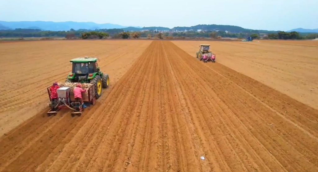 在廣西來(lái)賓市興賓區(qū)鳳凰鎮(zhèn)國(guó)家現(xiàn)代農(nóng)業(yè)產(chǎn)業(yè)園黃安優(yōu)質(zhì)“雙高”糖料蔗基地,田間地頭大型拖拉機(jī)、甘蔗種植機(jī)并列同步作業(yè),不到15分鐘,兩壟長(zhǎng)約200米的甘蔗全部種植完畢。
