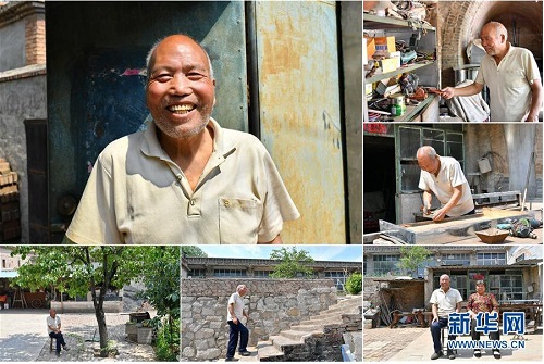 韓忠岐,男,1949年出生,山西省長治市潞城區(qū)垂陽村人,1976年起擔任村干部。從小熱愛學習的韓忠岐對鄉(xiāng)村發(fā)展有自己獨特的想法,他鼓勵村民們學習技能,在農(nóng)閑時“組團”外出打工,農(nóng)忙時鄰里互幫互助,曾經(jīng)貧窮的垂陽村在他的帶領下慢慢富裕起來。退休后,閑不下來的韓忠岐自學打鐵、電焊技能,現(xiàn)在成了鄉(xiāng)里小有名氣的鐵匠,經(jīng)常為貧困戶開展技術培訓。 左上:韓忠岐肖像;右上:韓忠岐在挑選工具;右中:韓忠岐在制作一個鐵皮抽屜;右下:韓忠岐和老伴坐在院子里;下中:韓忠岐去鄰居家串門;下左:韓忠岐在院子里乘涼(拼版照片,6月18日攝)。 地處晉東南的山西省長治市,位于由太行山、太岳山環(huán)繞而成的上黨盆地中。在群山中、崖壁上,許多村莊自然條件惡劣,基礎設施落后,脫貧致富是大山深處人們的迫切心愿。 近年來,一場場脫貧攻堅戰(zhàn),在一個個深山村打響。政府全力探索脫貧路徑的同時,山區(qū)百姓因地制宜,靠自己的雙手和智慧走上致富路,交出了一份扎實的脫貧答卷。 記者在太行山、太岳山一路尋訪,記錄下多位70歲老人的生活。這些共和國的同齡人,親歷了山鄉(xiāng)的巨變,見證著長治山區(qū)脫貧攻堅偉大工程的一步步推進。 新華社記者 曹陽 攝