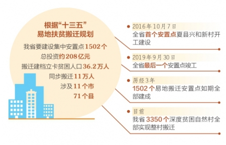 “十三五”易地扶貧搬遷啟動以來,我省有36.2萬貧困人口告別山莊窩鋪,搬進了公共設(shè)施配套齊全、產(chǎn)業(yè)就業(yè)措施完善的1502個易地扶貧搬遷集中安置點,這些安置點已成為貧困群眾穩(wěn)定脫貧的新起點、走向全面小康的新支點、實現(xiàn)鄉(xiāng)村振興的新亮點。