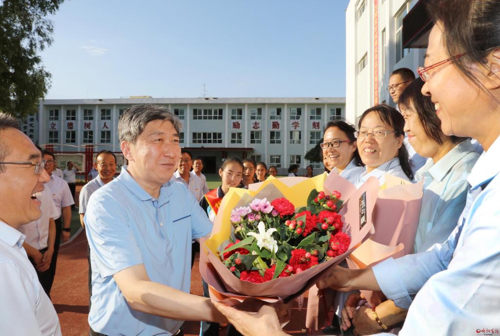 每到一處,朱曉東都向教師們致以節(jié)日問(wèn)候。長(zhǎng)征小學(xué)西校區(qū)是一所高標(biāo)準(zhǔn)規(guī)劃、高水平建設(shè)的新建學(xué)校,今年秋季學(xué)期投入使用。朱曉東察看電子圖書閱覽等教學(xué)新設(shè)施,了解學(xué)校開(kāi)設(shè)的書法、歌唱、手工、足球、乒乓球、跆拳道、機(jī)器人組裝等特色教育課程,隨機(jī)檢查學(xué)生飲用水機(jī)具,向從基層選拔聘用的優(yōu)秀教師代表贈(zèng)送書籍,勉勵(lì)大家珍惜崗位,肩負(fù)起時(shí)代賦予的重任,全心全意培養(yǎng)好人才。具有40多年歷史的忻州六中辦學(xué)底蘊(yùn)厚重,近年來(lái)與時(shí)俱進(jìn)提升教學(xué)能力。朱曉東實(shí)地了解學(xué)校發(fā)展情況后,一一為教師代表獻(xiàn)上鮮花,感謝大家辛勤付出,希望學(xué)校越辦越好,讓孩子們?cè)趯W(xué)校有更多收獲。忻州高級(jí)中學(xué)教學(xué)設(shè)施先進(jìn),教師隊(duì)伍素質(zhì)高、經(jīng)驗(yàn)豐富,今年學(xué)校畢業(yè)班高考再次取得好成績(jī)。朱曉東詳細(xì)了解學(xué)校歷史和往屆學(xué)生成就,鼓勵(lì)教師們放長(zhǎng)眼光,對(duì)照更高標(biāo)準(zhǔn)繼續(xù)努力,為忻州增光添彩。