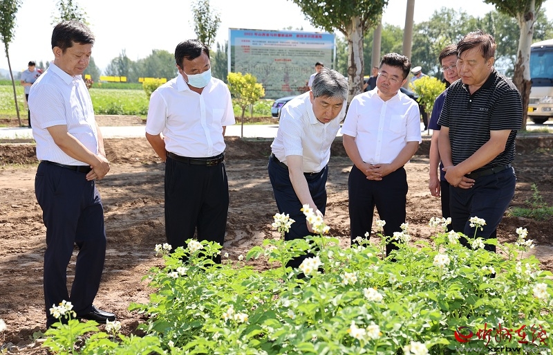 五寨是傳統(tǒng)農(nóng)業(yè)大縣,馬鈴薯種植歷史悠久。如今在小胡會(huì)村的馬鈴薯新品種、新技術(shù)示范基地,綠油油的馬鈴薯,白色小花競相開放,抬頭遠(yuǎn)眺,跨過大型移動(dòng)噴灌設(shè)備,馬鈴薯苗一眼望不到邊?;赝ㄟ^馬鈴薯新品種、新技術(shù)的示范,篩選出品質(zhì)優(yōu)、抗病性強(qiáng)、產(chǎn)量高、適宜本土種植的馬鈴薯新品種(系),推動(dòng)馬鈴薯先進(jìn)適用栽培新技術(shù)的推廣應(yīng)用。朱曉東走進(jìn)田壟,察看薯苗長勢,與農(nóng)技專業(yè)人員交流,了解減化肥減農(nóng)藥試驗(yàn)情況,詢問菜用型馬鈴薯與加工型馬鈴薯的價(jià)值區(qū)別。他強(qiáng)調(diào),要切實(shí)把五寨80里丁字平川耕地資源用足用好,深研細(xì)究新品種新技術(shù),不僅要在馬鈴薯的塊莖上做文章,在莖、葉、花上都要深入研究,調(diào)動(dòng)專業(yè)機(jī)構(gòu)專業(yè)人員在馬鈴薯花入茶、提取香精等更多方面努力探索,切實(shí)放大規(guī)模產(chǎn)業(yè)的獨(dú)特優(yōu)勢。