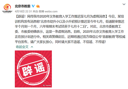 真相:北京市委教育工委、市教委明確表示,這是一條虛假消息。目前,2020年北京義務(wù)教育入學工作正在按計劃進行中。相關(guān)政策確定后,近期將通過官方微信公號“首都教育”等權(quán)威平臺發(fā)布。