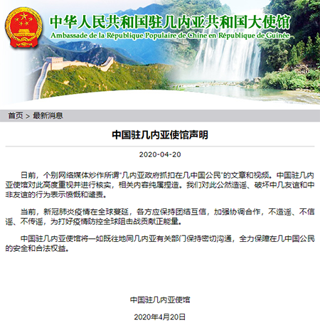 真相:4月20日,中國駐幾內(nèi)亞使館通過官方網(wǎng)站發(fā)布聲明表示,使館對此高度重視并進行核實,相關(guān)內(nèi)容純屬捏造。對此公然造謠、破壞中幾友誼和中非友誼的行為表示憤慨和譴責。