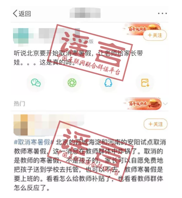 中國互聯(lián)網(wǎng)聯(lián)合辟謠平臺(tái)第一時(shí)間向教育部相關(guān)部門求證,確認(rèn)“北京、河南試點(diǎn)取消教師寒暑假”為不實(shí)消息。