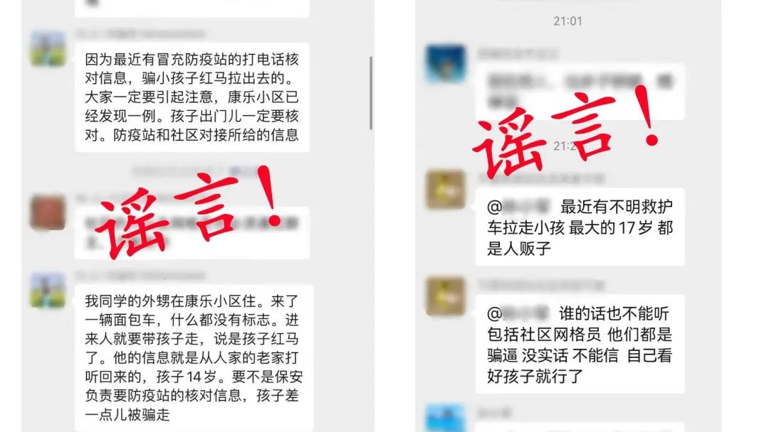 近日,本地微信群傳播:“最近有冒充防疫站的打電話(huà)核對(duì)信息,騙小孩紅馬拉出去的。大家一定要引起注意,康樂(lè)小區(qū)已經(jīng)發(fā)現(xiàn)一例”、“最近有不明救護(hù)車(chē)?yán)咝『?,最大?7歲,都是人販子”。