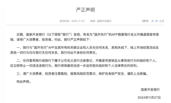 詳情:近期,有名為“國開先行”的APP假冒國家開發(fā)銀行名義開展虛假宣傳營銷,誤導廣大消費者、投資者。對此,國家開發(fā)銀行于11月27日在官網(wǎng)發(fā)布《嚴正聲明》: