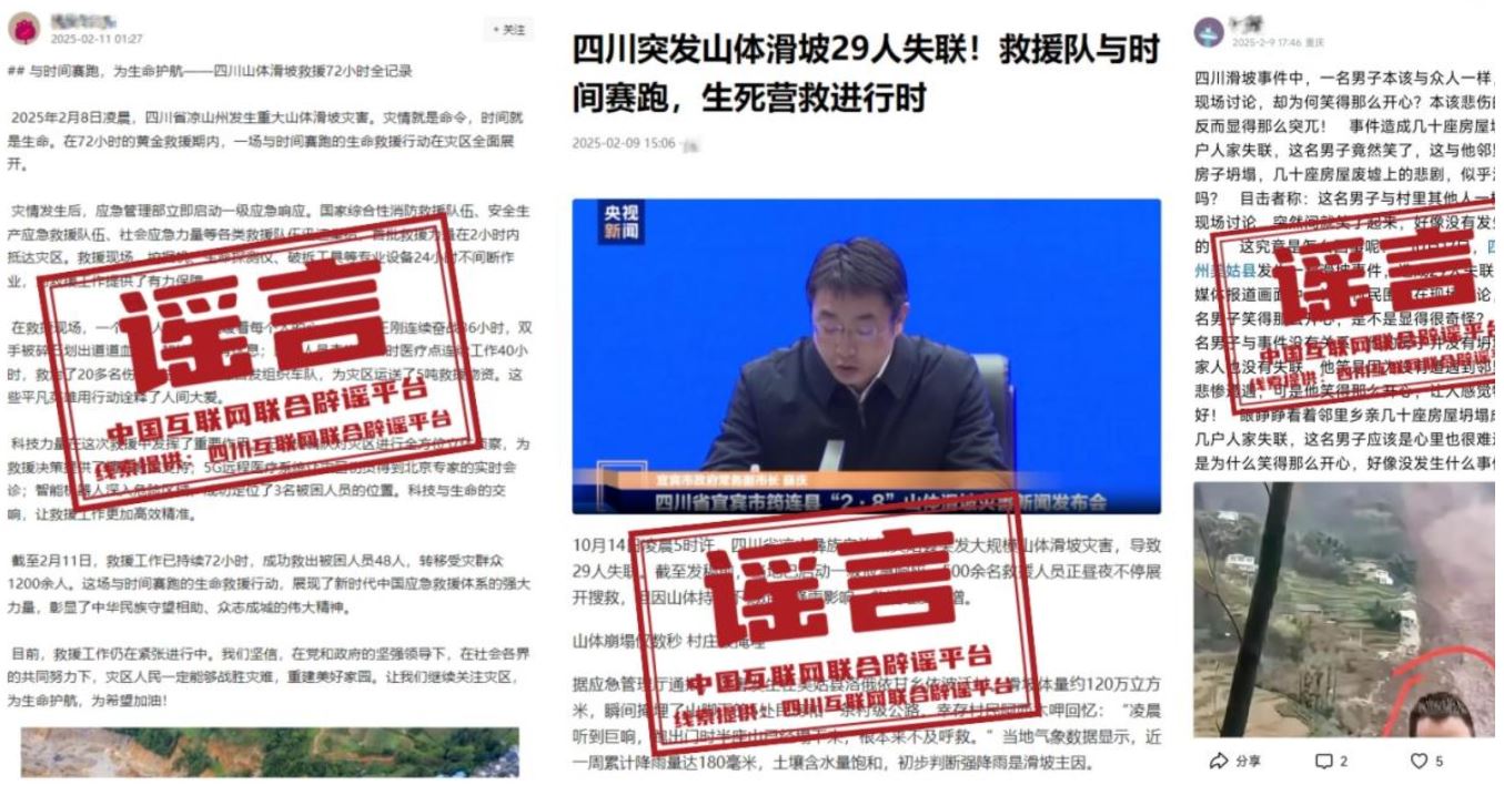 2月9日,有網(wǎng)民在某網(wǎng)絡(luò)平臺(tái)發(fā)布題為《30人被埋!四川山體崩塌瞬間曝光,行車記錄儀拍下死神奪命10秒》的帖文。經(jīng)核實(shí),帖文配圖均為嫁接舊聞、圖文翻炒,網(wǎng)民將2024年8月茂縣山體滑坡救援現(xiàn)場(chǎng)、2016年12月宜賓市長(zhǎng)寧縣下長(zhǎng)鎮(zhèn)永利村一村民被推土機(jī)掩埋致死事件的舊聞重新拼接合成,編造為宜賓筠連山體滑坡最新動(dòng)態(tài)后發(fā)布。(來(lái)源:四川互聯(lián)網(wǎng)舉報(bào)辟謠平臺(tái)、宜賓網(wǎng)警)