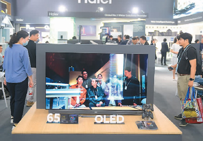 4月16日,在廣東省廣州市舉行的第135屆廣交會上,客商在了解、選購海爾OLED電視。新華社記者 盧漢欣攝