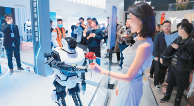3月14日,在上海市舉辦的中國家電及消費(fèi)電子博覽會上,海爾公司的AI人形家庭機(jī)器人現(xiàn)場向人們贈送玫瑰。陳玉宇攝(人民視覺)