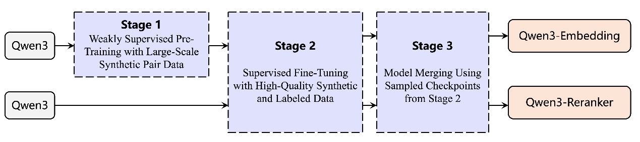 向量模型像是AI的“翻譯器”,它可以將文本、圖片等人類可認(rèn)知的非結(jié)構(gòu)化信息,映射到機(jī)器更易理解的向量空間,再基于這些向量實(shí)現(xiàn)高效的信息分類、檢索或排序。也正因此,向量模型對(duì)于提升AI的語(yǔ)義理解、信息檢索、多模態(tài)融合等核心能力至關(guān)重要。基于千問(wèn)3模型,通義團(tuán)隊(duì)通過(guò)對(duì)比訓(xùn)練、SFT、模型融合等方法,打造出全新的千問(wèn)3向量模型,包含文本嵌入模型 Qwen3-Embedding以及文本排序模型Qwen3-Reranker。