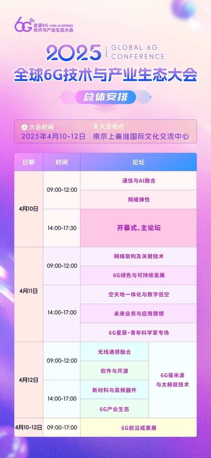 4月10日至12日,由未來移動通信論壇、紫金山實驗室主辦的2025全球6G技術與產(chǎn)業(yè)生態(tài)大會(原全球6G技術大會)將在南京上秦淮國際文化交流中心召開。本次大會以“共筑創(chuàng)新 同享未來”為主題,來自全球的6G領域的思想領袖、技術先鋒和產(chǎn)業(yè)領軍人物將再次齊聚金陵,共同探討6G技術創(chuàng)新與未來產(chǎn)業(yè)生態(tài)的發(fā)展藍圖。
