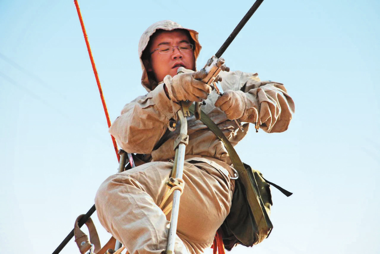 機(jī)會(huì)都是留給有準(zhǔn)備的人。上班第9個(gè)年頭,張杰第一次參加行業(yè)技能比賽。在國(guó)網(wǎng)忻州供電公司帶電技術(shù)比武中,他不僅取得個(gè)人第一名的好成績(jī),還和隊(duì)友共同取得了團(tuán)體第一名的成績(jī)。在國(guó)網(wǎng)山西省電力公司組織的帶電技術(shù)比武中,他連續(xù)三屆獲得團(tuán)體前三名、個(gè)人前六名的成績(jī)。憑借過(guò)硬的技能素質(zhì),張杰成為帶電班班長(zhǎng)。2009年,向神池義井變電站供電的220千伏萬(wàn)義線(xiàn)3號(hào)塔—4號(hào)塔間導(dǎo)線(xiàn)出現(xiàn)斷股情況,嚴(yán)重影響轄區(qū)人民生產(chǎn)生活。面對(duì)這一險(xiǎn)情,張杰帶領(lǐng)班組人員迅速趕赴現(xiàn)場(chǎng)。該故障點(diǎn)距地面有40多米高,由于陣風(fēng)強(qiáng)、檔距大,別說(shuō)處理故障,爬軟梯登高都比平時(shí)困難。此時(shí),張杰第一個(gè)換上工作服,爬上軟梯,經(jīng)過(guò)多次嘗試,最終順利完成維修任務(wù)。