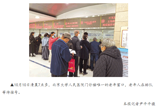 “趕緊地,再晚兩步,號兒就被人用手機(jī)搶光了!”10月10日早晨7點,李玉蓉緊捯碎步,催促身后的老伴一起往北京大學(xué)人民醫(yī)院門診樓里沖。