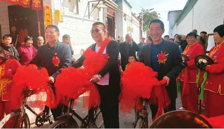 婚禮當天,杜家寨社區(qū)兩委班子陪著新郎官一起,騎上老式帶大梁的自行車。新郎官身上披紅掛彩喜氣洋洋,車上挽著大紅花,在鄉(xiāng)親們的簇擁和威風鑼鼓隊的陣陣鼓樂聲中,騎行來到新娘子的家中,把美麗的新娘子抱在自行車后座的紅墊子上,熱熱鬧鬧地娶回了家。