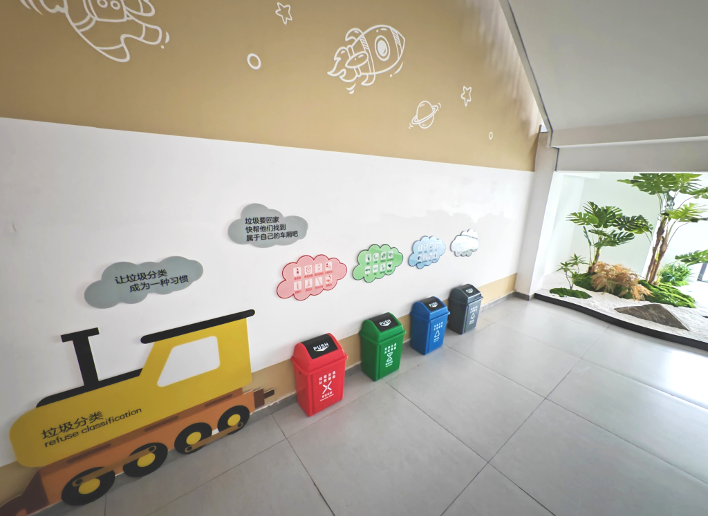 3月28日,悅?cè)菪W教學樓內(nèi)的垃圾分類箱。新華社記者楊帆攝