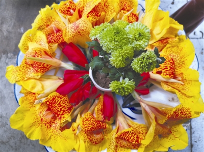 他用鮮花點(diǎn)綴菜攤