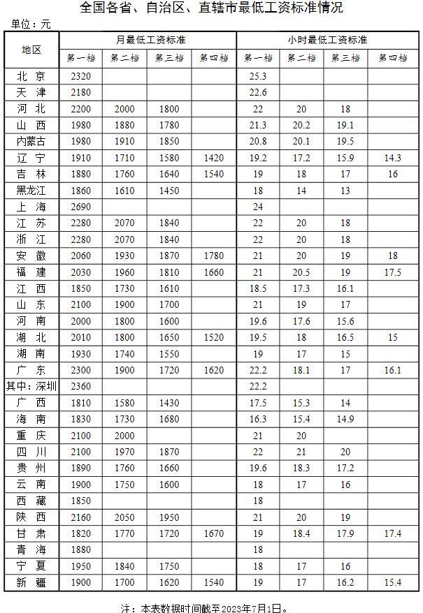 人社部官網(wǎng)近日公布了全國各省、自治區(qū)、直轄市最低工資標準情況(截至2023年7月1日),其中,剛剛上調最低工資標準的上海,月最低工資標準繼續(xù)穩(wěn)居全國首位。