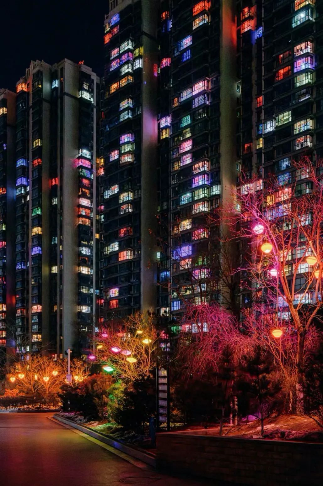 更教人驚嘆的是,大家不約而同在春節(jié)期間的夜里亮起彩燈,成百上千戶在一起頗具規(guī)模,酷炫的彩燈頗具未來感和科技感,給人一種置身未來城市的錯(cuò)覺。