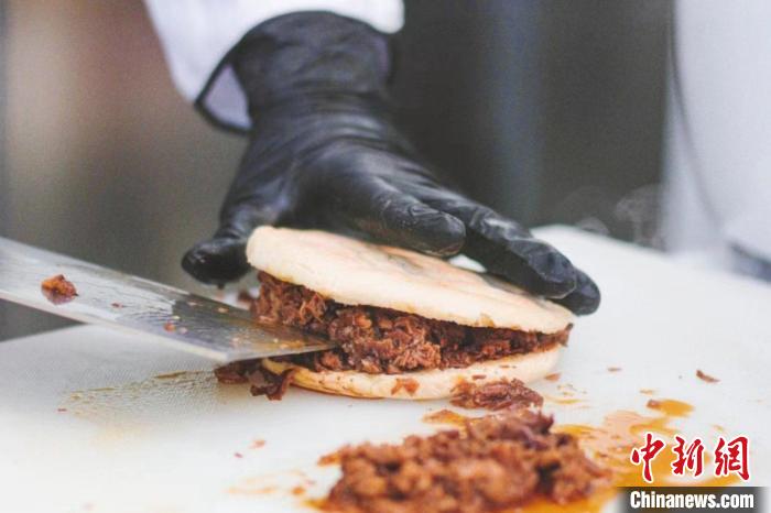在意大利米蘭華人街,一家中國(guó)小吃店門前排著長(zhǎng)隊(duì)。玻璃櫥窗后的操作間里,廚師撈出剛煮好的臘汁肉,切成肉燥,現(xiàn)烙的白吉饃從中切開,填入肉燥后再淋上肉汁,這饃酥肉香的肉夾饃,吸引食客們?cè)诼愤叴罂於漕U。