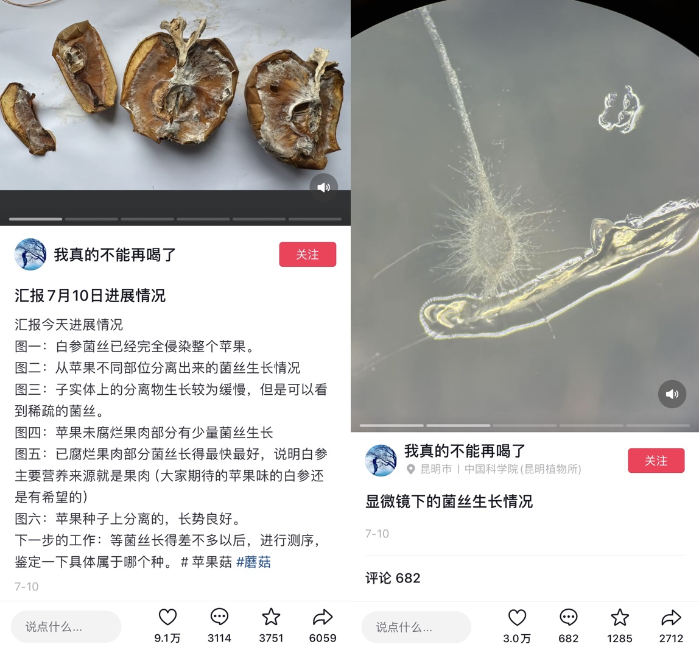 拿到樣本后,許博士對蘋果做了切片觀察,還在抖音上向網(wǎng)友實(shí)時(shí)更新起了菌絲生長情況,引發(fā)越來越多網(wǎng)友的“追更”。之后又有科普創(chuàng)作者@植物眼 專門采訪許博士的導(dǎo)師趙琪,他的細(xì)致講解讓很多網(wǎng)友紛紛表示“又學(xué)到了新知識”。