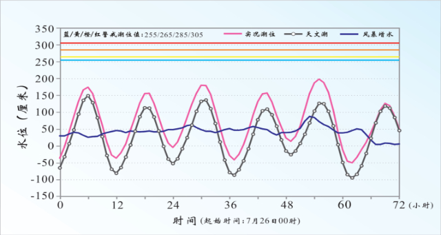 2023年7月28日“杜蘇芮”臺風(fēng)風(fēng)暴潮發(fā)生時,福建東山站實測潮位、天文潮和風(fēng)暴增水隨時間變化情況,圖中清晰地反映出風(fēng)暴潮與天文潮疊加后,實時潮位明顯升高。(資料來源:《2023中國海洋災(zāi)害公報》)