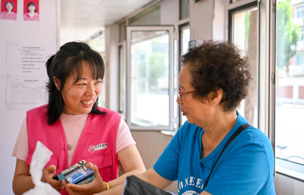 在天津市河西區(qū)賓西樓居家養(yǎng)老服務(wù)中心,劉緩緩(左)為老人辦理業(yè)務(wù)時與老人聊家常。新華社記者 孫凡越 攝