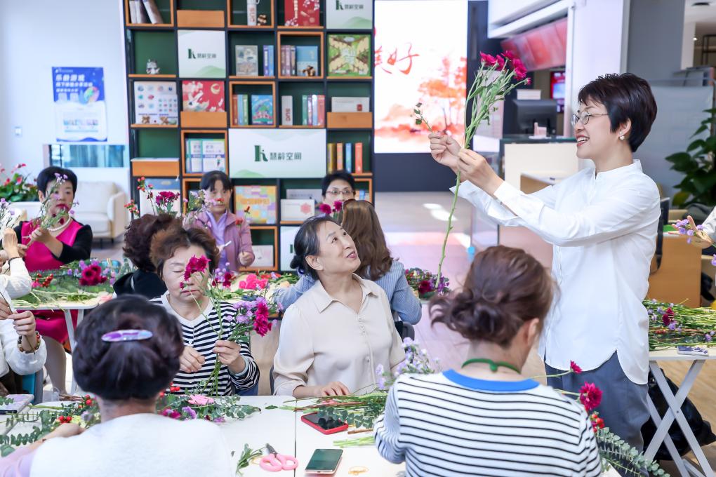 在國家老年大學(xué)魏公村校區(qū)課堂上,老師黃山正在講授插花課程。(國家老年大學(xué)供圖)