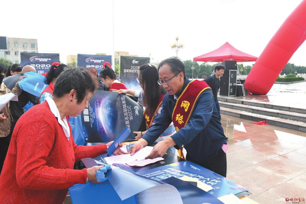 在2020年國家網(wǎng)絡(luò)安全宣傳周活動(dòng)中,定襄縣采取多部門聯(lián)合的方式,通過懸掛宣傳橫幅、擺放宣傳展板、發(fā)放網(wǎng)絡(luò)安全知識(shí)手冊(cè)等形式,深入宣傳數(shù)據(jù)安全管理、個(gè)人信息保護(hù)等方面的法規(guī)、標(biāo)準(zhǔn),并重點(diǎn)圍繞個(gè)人信息保護(hù)、網(wǎng)上交易辦理、惡意軟件清理、金融詐騙防范等市民關(guān)心關(guān)注的內(nèi)容開展宣講、提供咨詢服務(wù),切實(shí)提高廣大人民群眾網(wǎng)絡(luò)安全意識(shí)和防護(hù)技能,引導(dǎo)廣大群眾依法用網(wǎng)、文明用網(wǎng),營(yíng)造健康文明的網(wǎng)絡(luò)環(huán)境。圖為9月15日縣城宣傳現(xiàn)場(chǎng)。 張玉虎 攝