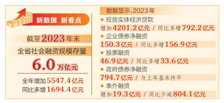 數(shù)據(jù)顯示,2023年,投放實(shí)體經(jīng)濟(jì)貸款增加4201.2億元,同比多增792.2億元,支撐力度依然穩(wěn)固;企業(yè)債券凈融資150.3億元,同比多增156.9億元;股票融資46.9億元,同比多增33.6億元;政府債券凈融資794.7億元,與上年基本持平;表外融資增加19.3億元,同比少減804.1億元。