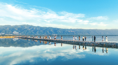 6月9日,運(yùn)城市七彩鹽湖景區(qū)游人如織,藍(lán)天、白云、遠(yuǎn)山、鹽湖構(gòu)成一幅美麗畫卷,游客們宛如穿梭在“天空之鏡”。金玉敏攝